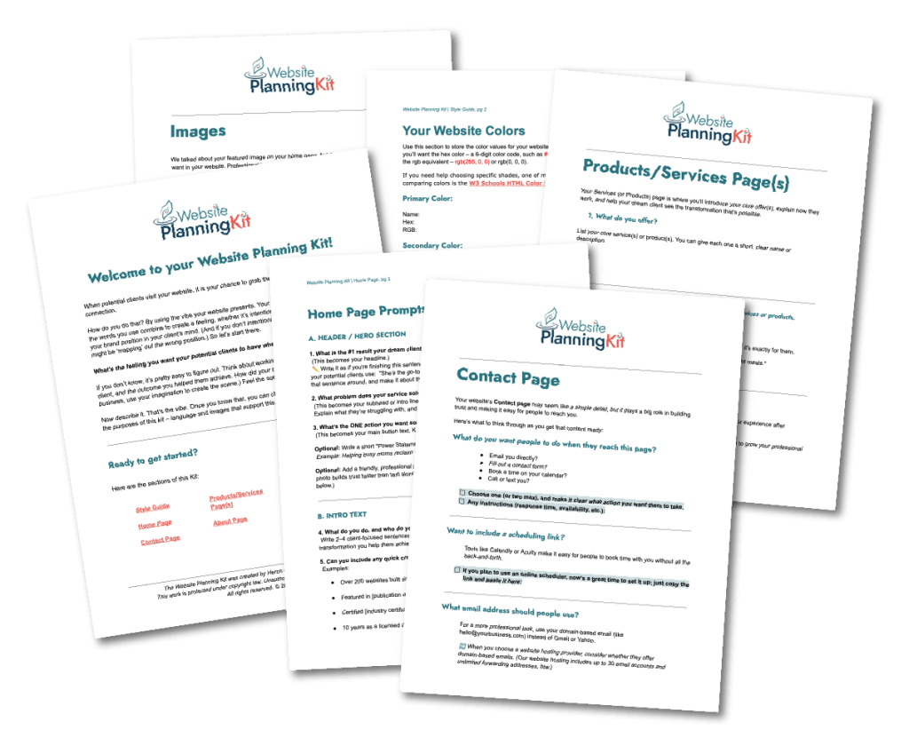 Now, I’ve pulled those questionnaires, prompts, and checklists into a stand-alone, affordable kit to give even more business owners an easy way to launch your website.